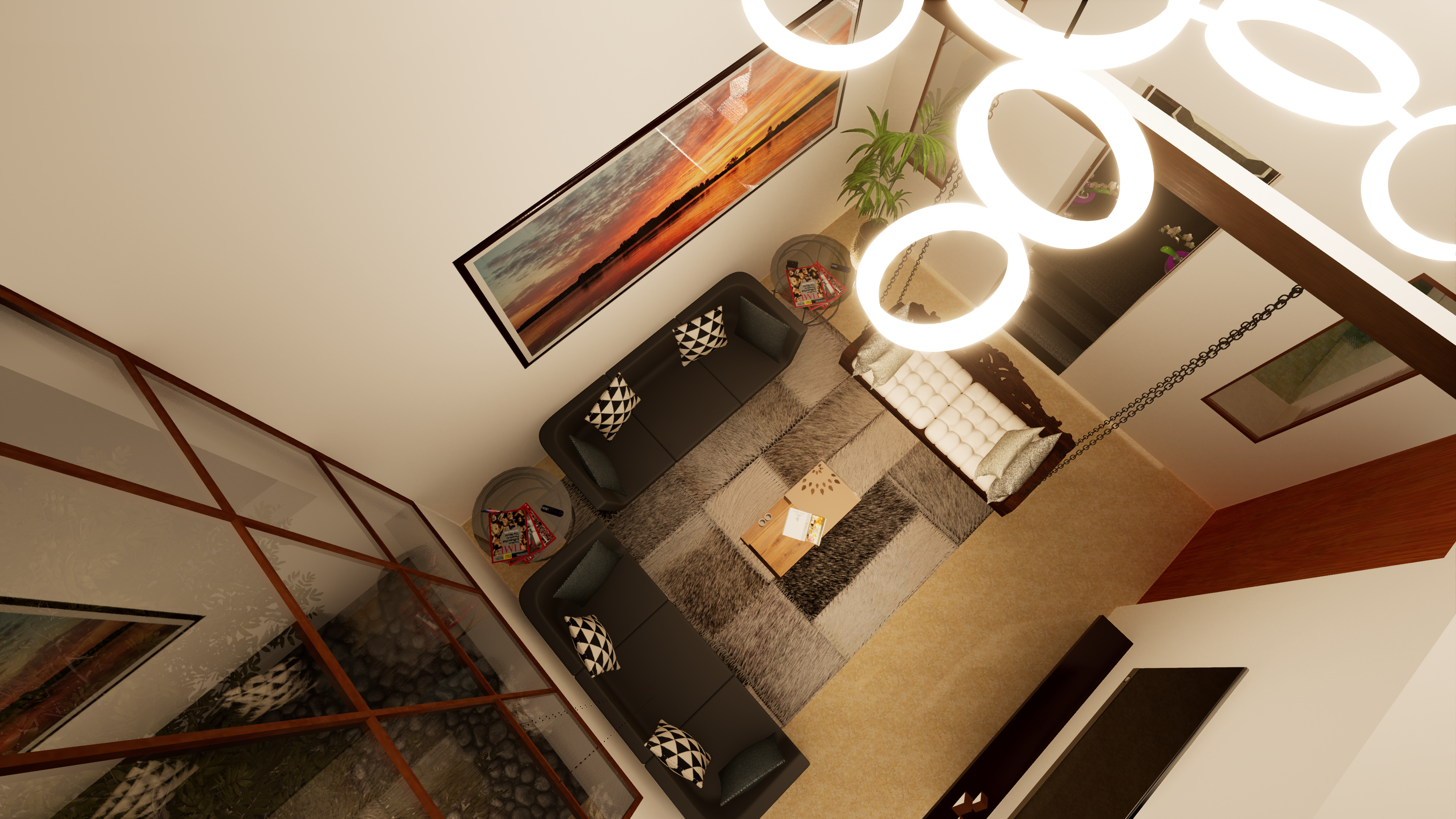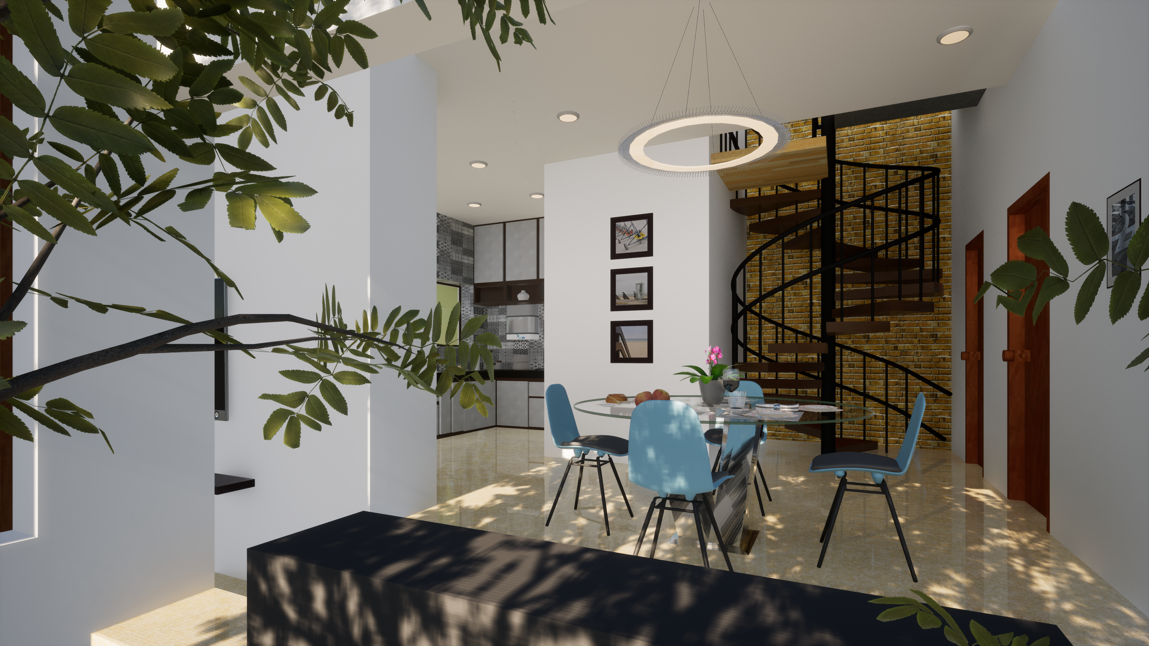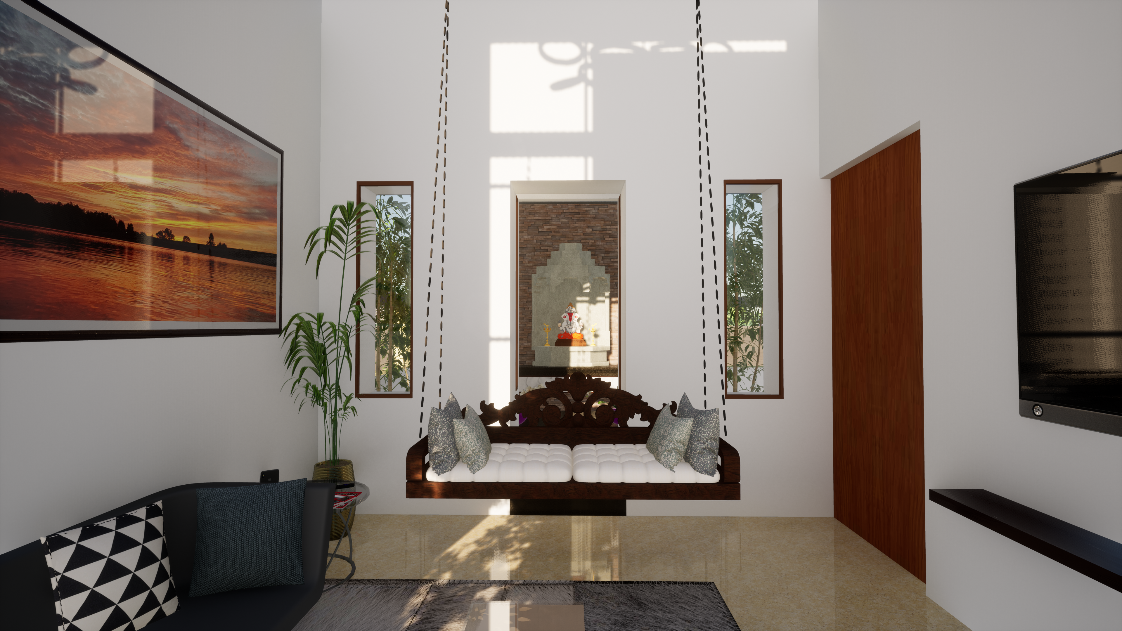 The double-height living room offers a grand welcome into the house, and ensures visual connectivity across floors to foster a sense of spaciousness. A sculptural puja room surrounded by greenery offers a tranquil space for spiritual reflection. Each room benefits from dual ventilation, ensuring a fresh and comfortable living environment throughout the year, as well as reducing bills.